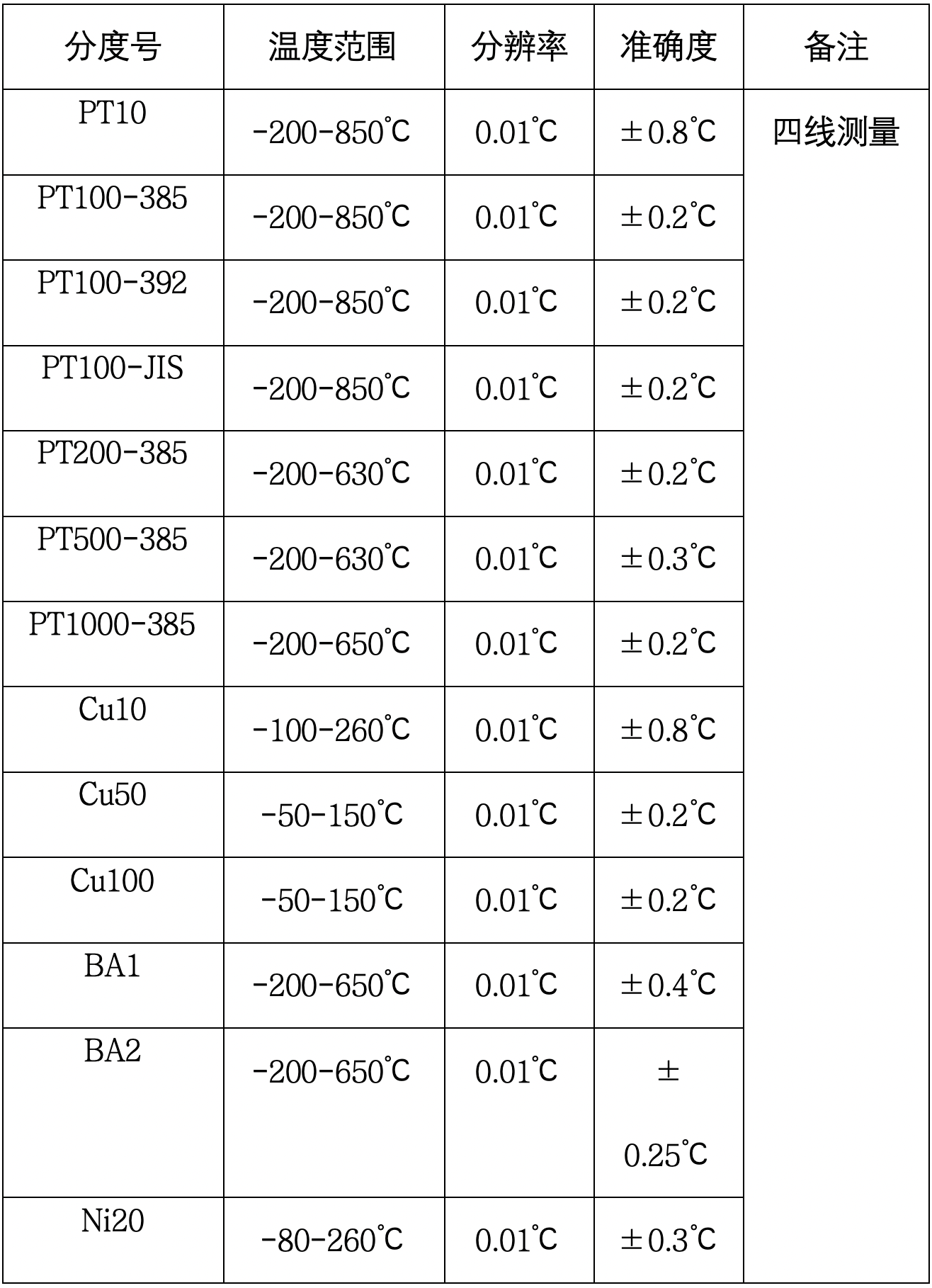 l 熱電阻種類:PT100-385,PT100-392,PT100-JIS,PT200-385,PT500-385,PT1000-385,